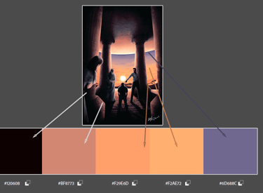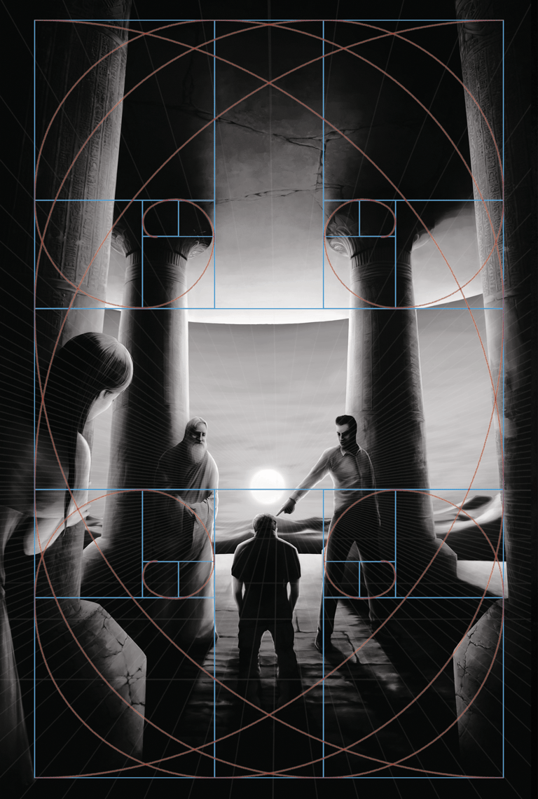 Com o intuito de fazer que a leitura da imagem seguisse a ordem deseja (Centro da imagem → personagens julgadores → personagem julgado → garota observando), foi aplicado ao desenho o conceito da Proporção Áurea, que é uma constante matemática presente na natureza e que indica a direção do olhar do leitor quando aplicada à uma imagem um pouco mais complexa. Assim, quatro proporções áureas foram inseridas na ilustração, fechando a imagem em dois quadrantes principais, onde os personagens "julgadores" foram posicionados. Para que o centro da imagem fosse focado como início da "leitura", foi posicionado o elemento com a cor mais contrastante e "quente" da figura (o sol). Logo abaixo, seguindo a linha de horizonte gerada pela Proporção, foi colocado o personagem "julgado" e por fim, fora dos posicionamentos gerados pela Proporção, foi inserida a personagem "observadora". Os demais itens da ilustração foram reposicionados para que seguissem as curvaturas da Proporção Áurea, organizando a visualização da cena na ordem desejada.