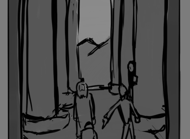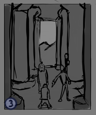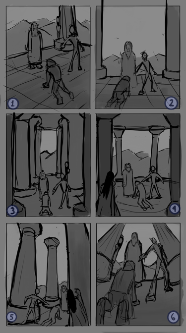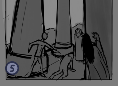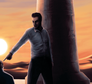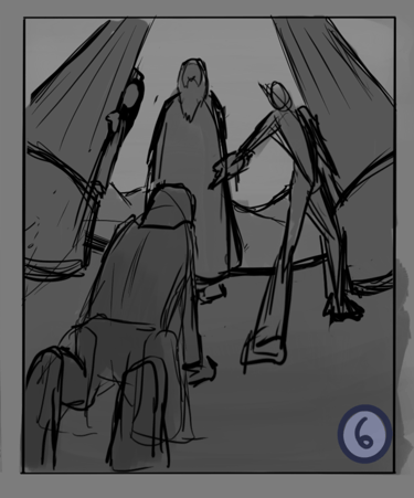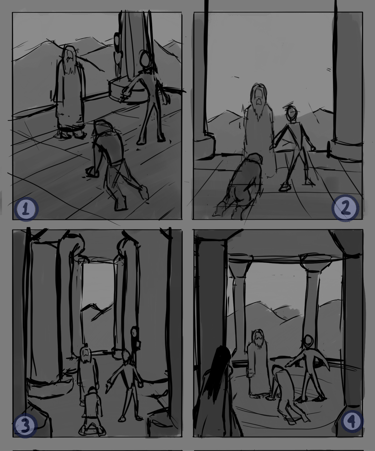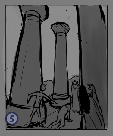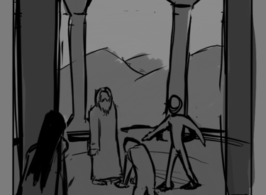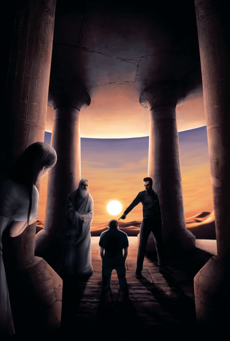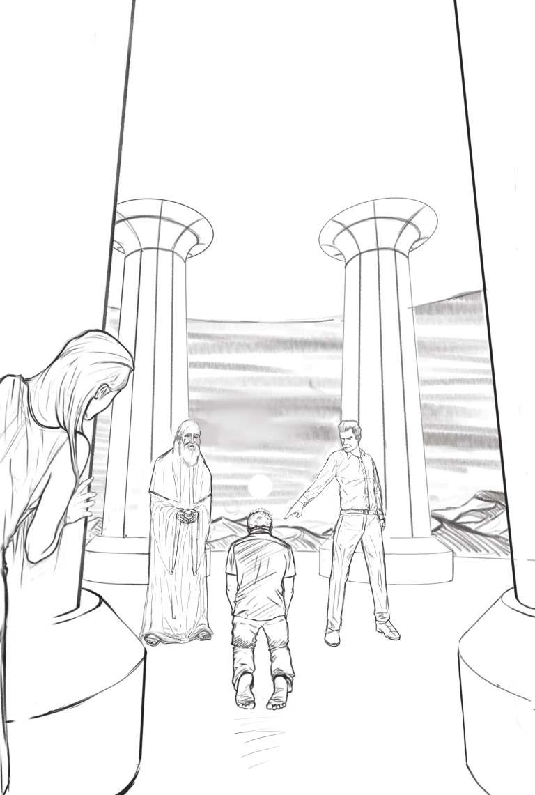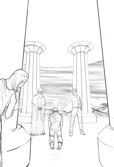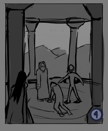 Desafio: Desenvolver uma ilustração para capa de livro que representasse uma cena marcantes de um dos capítulos. A cena deveria ambientar o local da "batalha" e representar uma espécie de julgamento. A atenção da cena precisava ser focada no personagem principal, passando o foco para dois personagens antagônicos e por último revelar uma figura feminina que espreita a situação de longe.