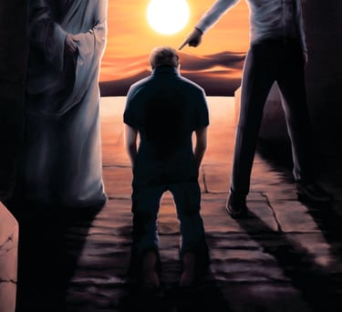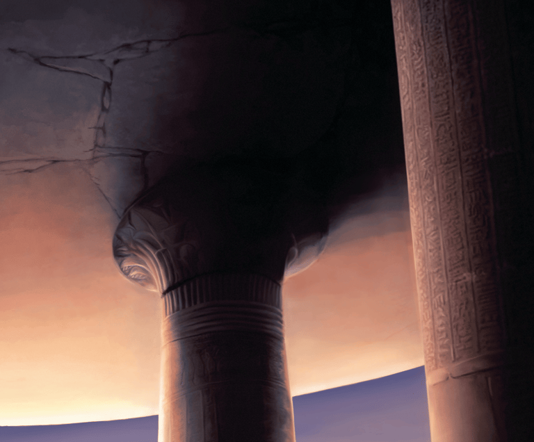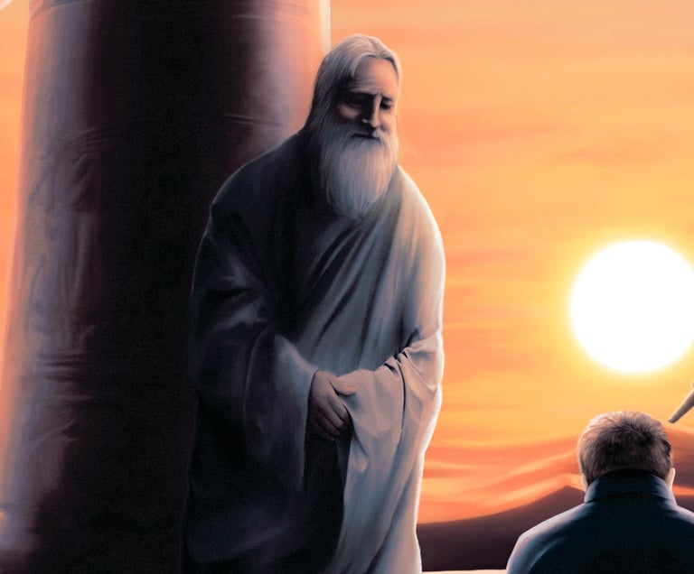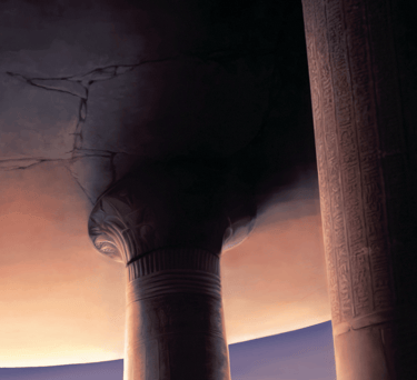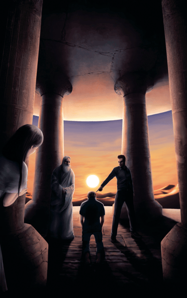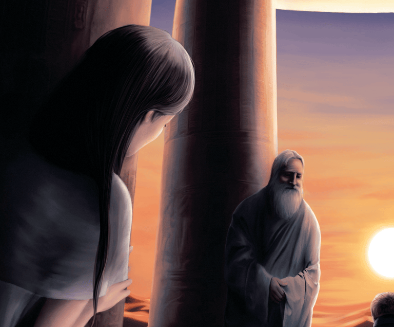 Um considerável cuidado foi exigido para capturar a essência desta cena, com elementos como silhuetas distantes e uma atmosfera sobrenatural. A escolha de cores e iluminação contribui para a natureza enigmática da ilustração, ao mesmo tempo em que mantém um senso de profundidade e realismo. O resultado geral é uma peça trabalhosa e cativante que transmite de forma eficaz a atmosfera desejada de mistério e julgamento, com proporções divinas e num cenário obscuro, mesmo que sob um sol brilhante.