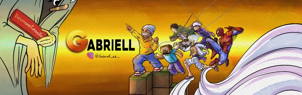 Descrição: Banner para YouTube retratando o personagem original do cliente (blusa amarela) lutando em conjunto com seus personagens favoritos de diferentes mídias (Steve, Levi, Luffy, Satoro Gojo e Homem Aranha) contra o fantasma da "desmonetização" de canais (amplie a imagem para exibir).