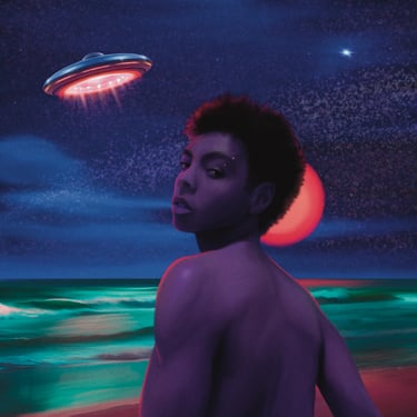 Descrição: Encomenda de arte com elementos psicodélicos para capa de álbum musical, a ser lançado em plataformas digitais, representando cantor em uma praia noturna.