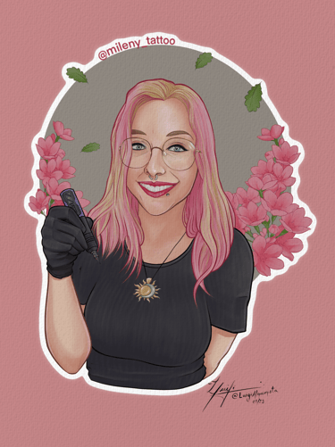 Descrição: Arte desenvolvida para profissional da área de tatuagens para ser utilizada como adesivos e outras divulgações em meio físico (impressão), bem como para divulgação digital (redes sociais)