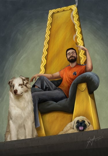 Descrição: Retrato do cliente com seus dois pets utilizando suas roupas confortáveis preferidas num trono de ouro semelhante ao utilizado pelo personagem Cuzco da animação "A Nova Onda do Imperador"