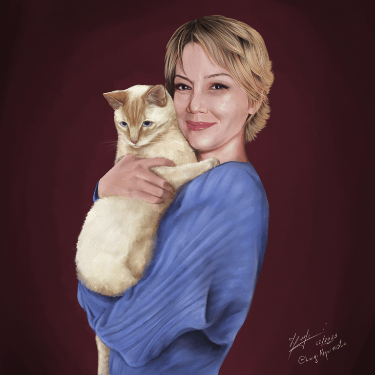 Descrição: Encomenda de arte representando o retrato de um familiar com o pet em seus braços. Criação original com uso de referências do rosto da pessoa e do animal em pose criada pelo artista.