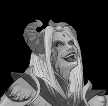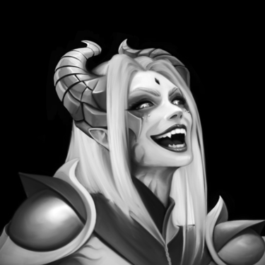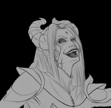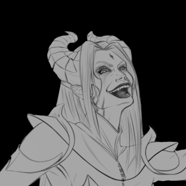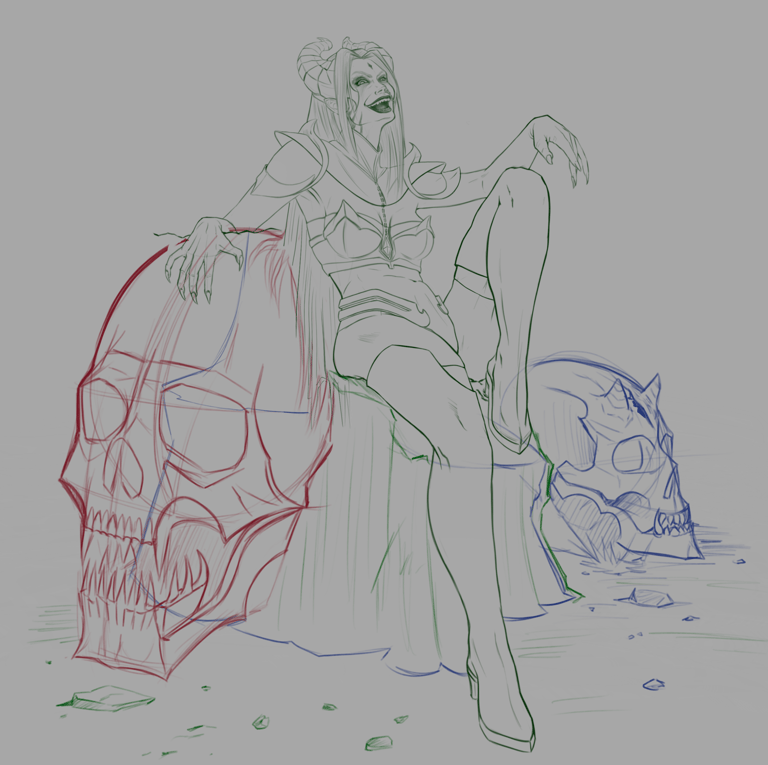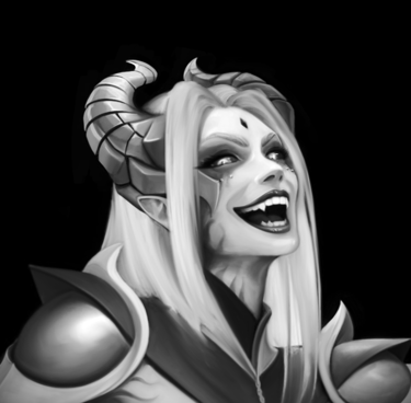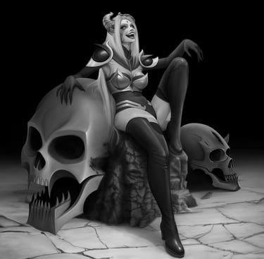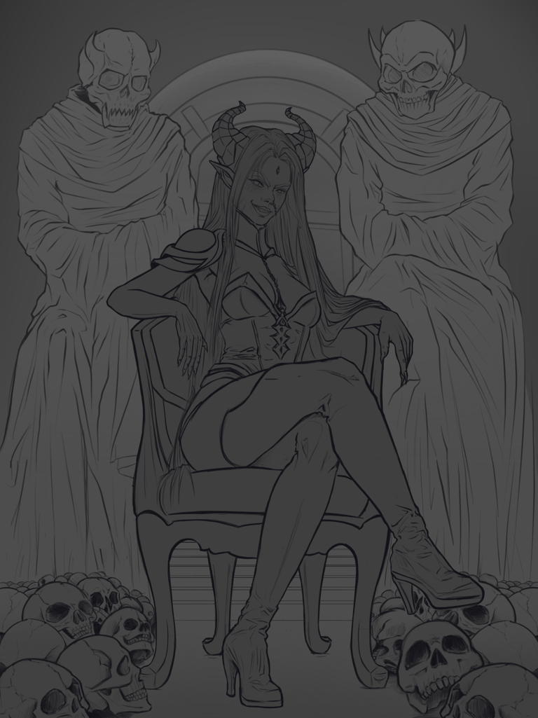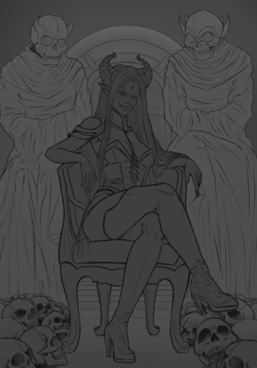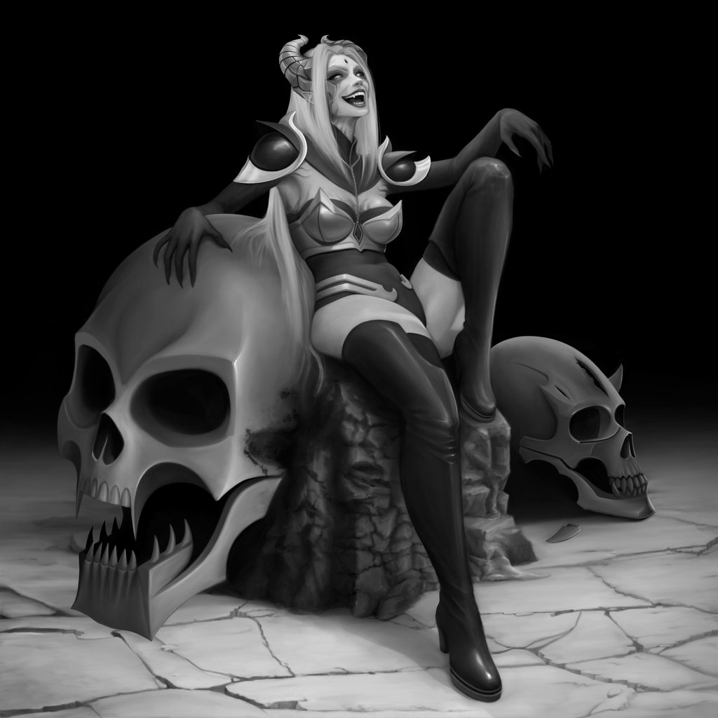 Essa Splash Art retrataria a personagem diante da entrada do templo do Caos, acompanhada de dois guardiões gigantes ao fundo, enquanto está sentada em um trono entre pilhas de crânios. Durante o processo de criação, optou-se por remover a ideia da coroa de pedras flutuantes, pois foi percebido que tal elemento talvez não se encaixasse bem na personagem, que não representa aspectos de realeza, mas sim sacerdotais.