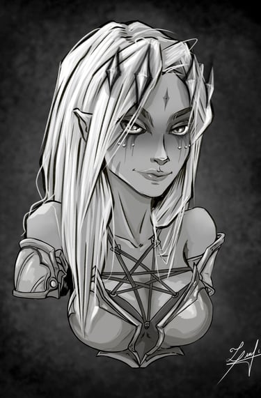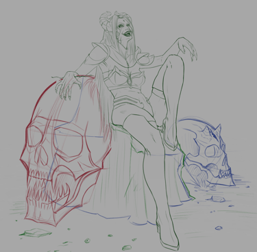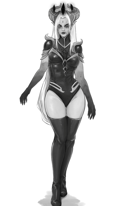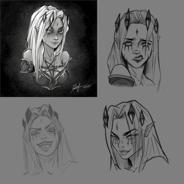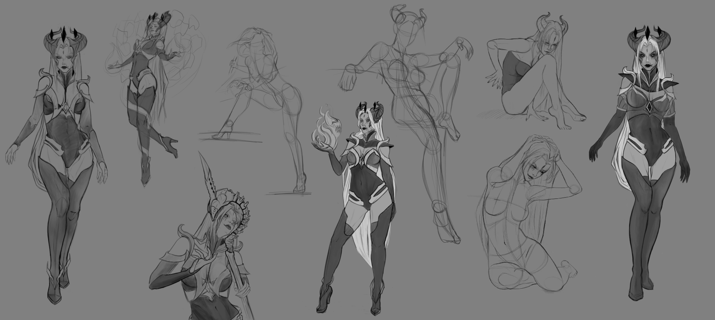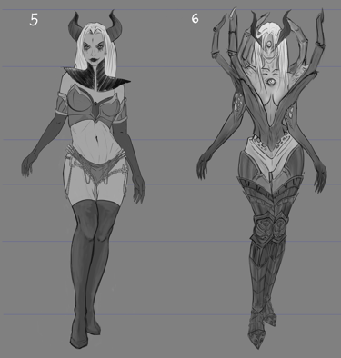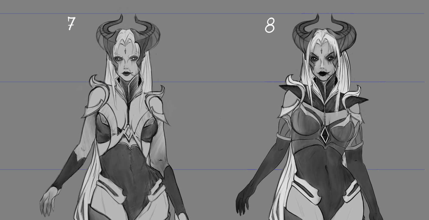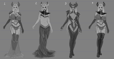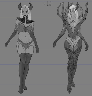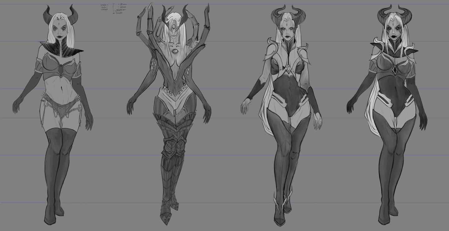 Após definir sua história como a "Sacerdotisa do Caos" dentro do universo de Valfir, uma série de modificações e testes conceituais foram aplicados à personagem.