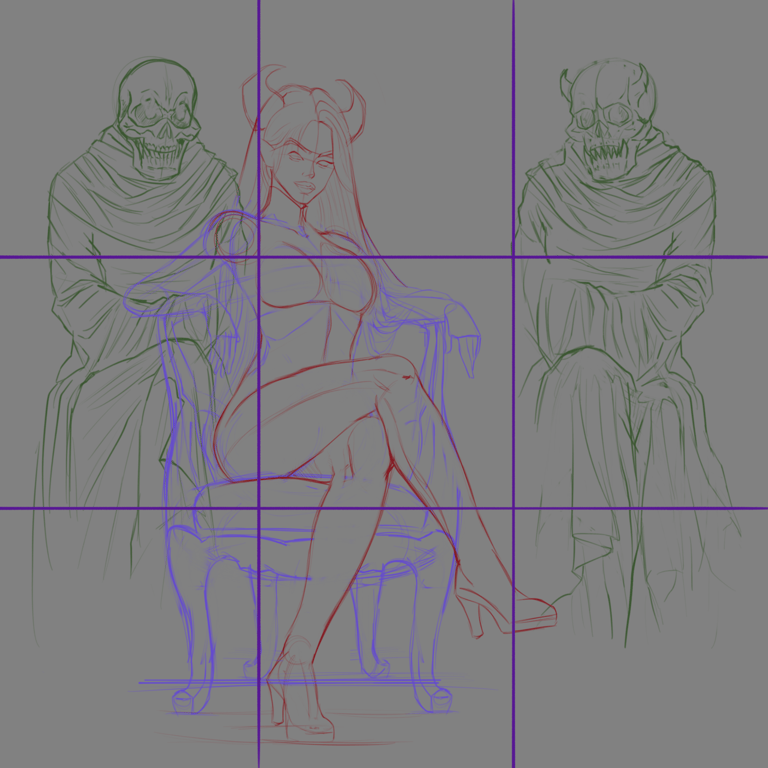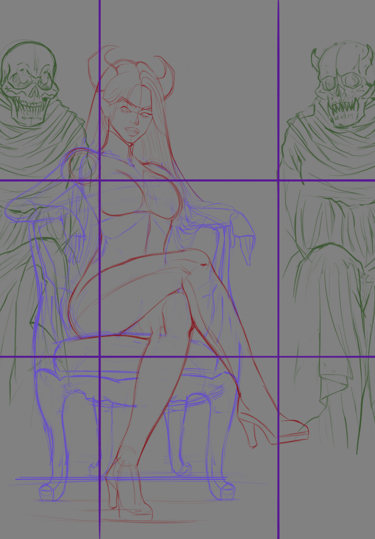 A partir desses estudos, dei início ao desenvolvimento de uma Splash art (ou promo art) da personagem. Esse tipo de arte visa proporcionar uma representação visual vívida e atrativa da personagem, destacando-a em uma pose dinâmica ou que capture sua personalidade distintiva.