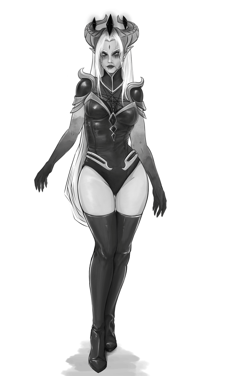 Inicialmente concebida como um ser antropomórfico, porém não humano, ela já apresentava elementos distintivos, incluindo uma coroa mágica composta por pedras negras que flutuavam ao redor de sua cabeça, cabelos brancos e um traje que mesclava características de armadura com detalhes mais refinados.