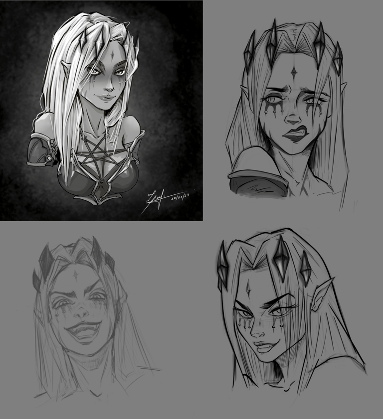 A quinta versão procurou corrigir alguns elementos de overdesign presentes na primeira iteração. Esse tipo de design excessivo dificulta potenciais animações, tanto em 2D quanto em 3D, que poderiam ser desenvolvidas posteriormente para o personagem. A sexta versão, por sua vez, foi concebida como um teste, ampliando os traços malignos da personagem em sua aparência, porém divergiu consideravelmente da proposta original (ainda que eu goste de pensar nessa versão como uma transformação da personagem).